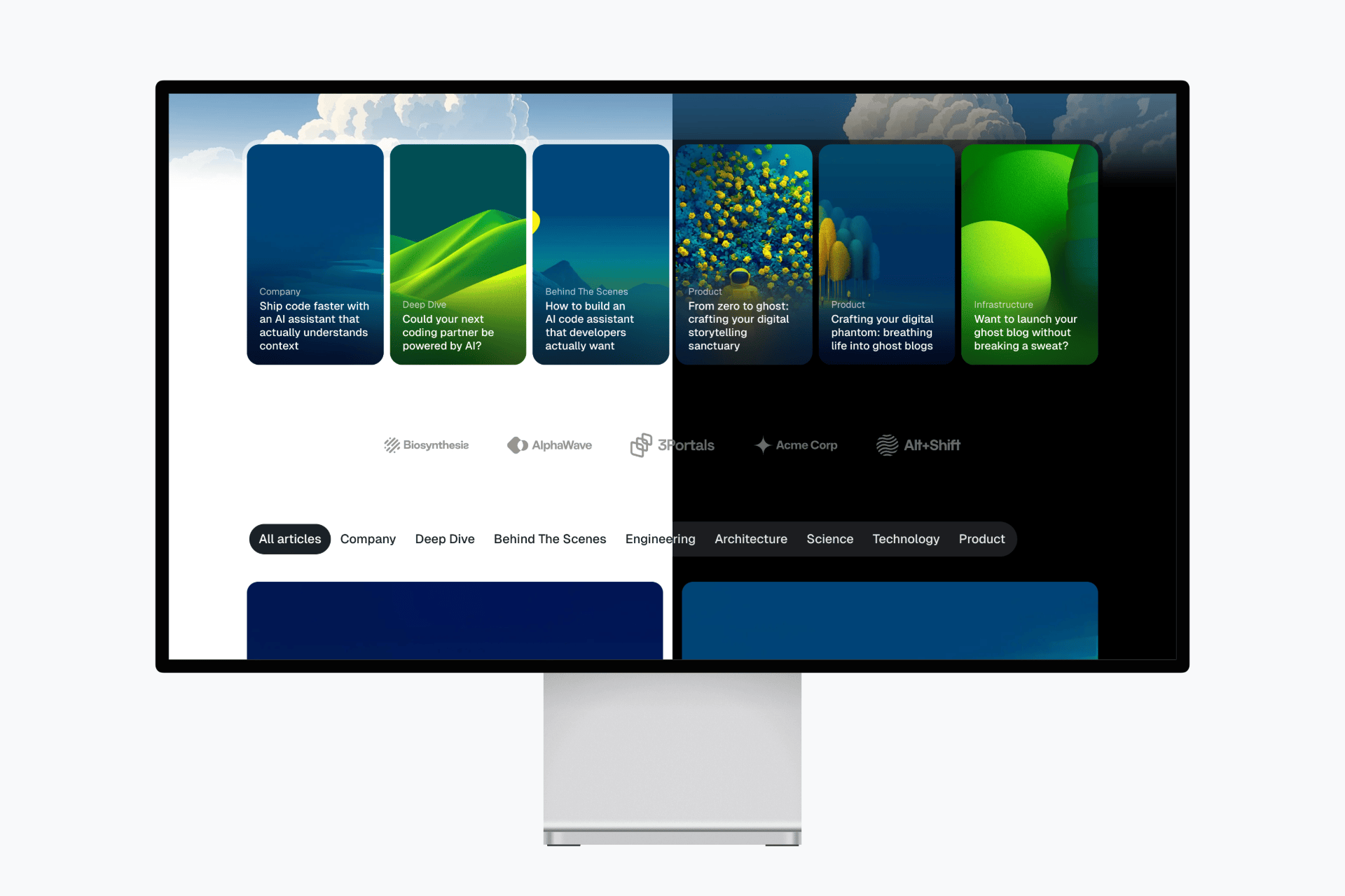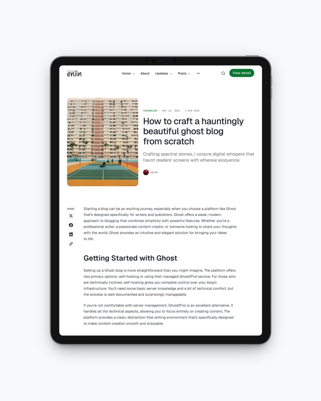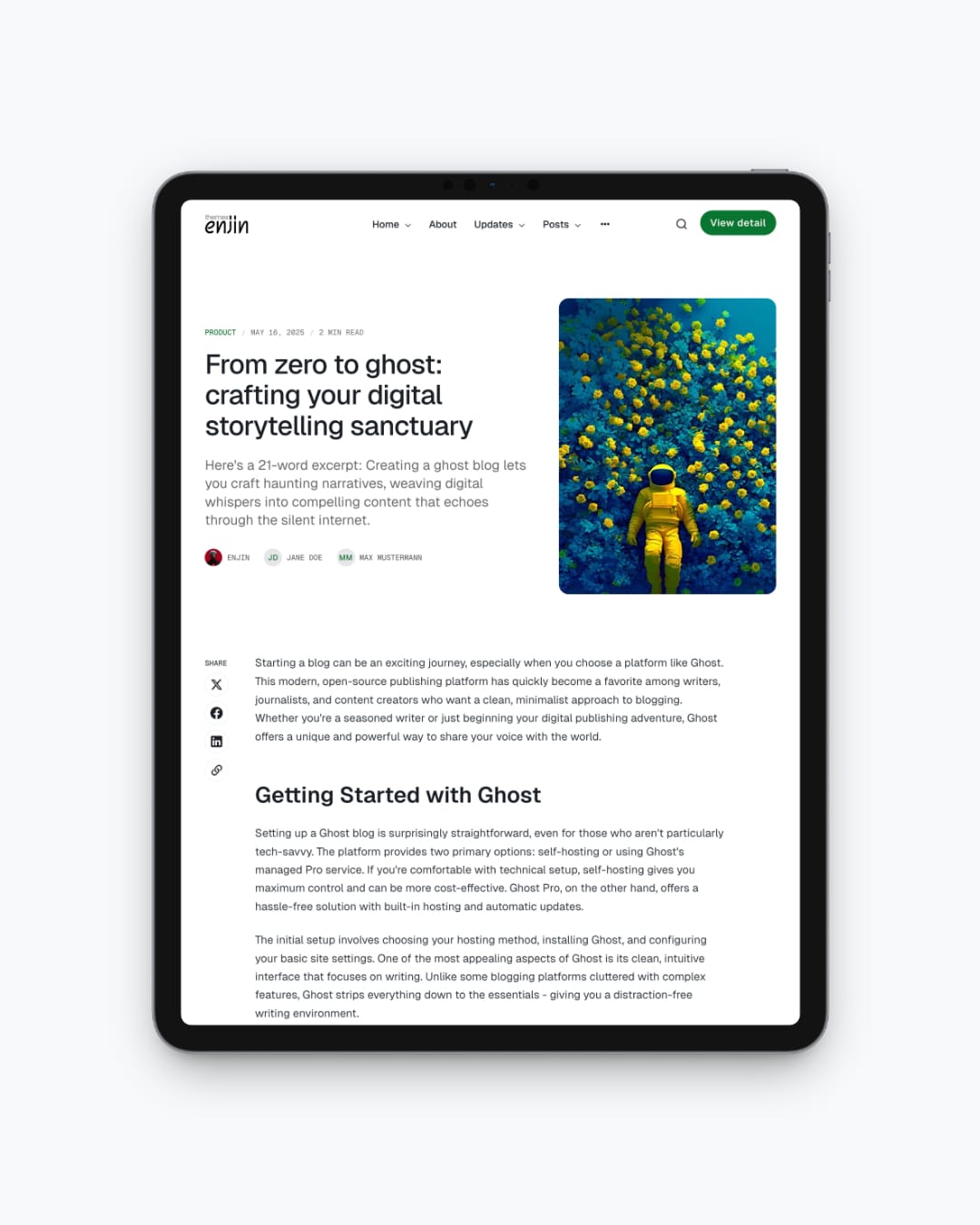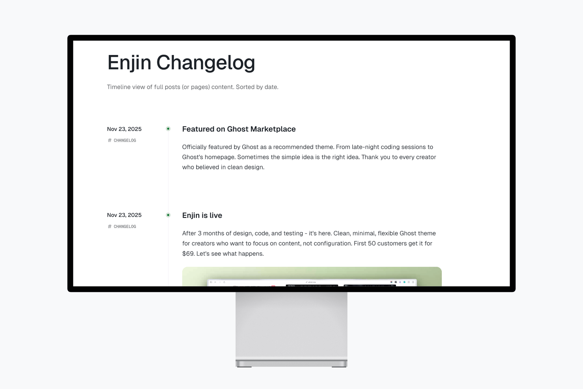 No more forcing visitors to click through to category pages. Enjin's smart category filter lives right on your homepage, powered by Ghost's Content API for instant, lightning-fast filtering.